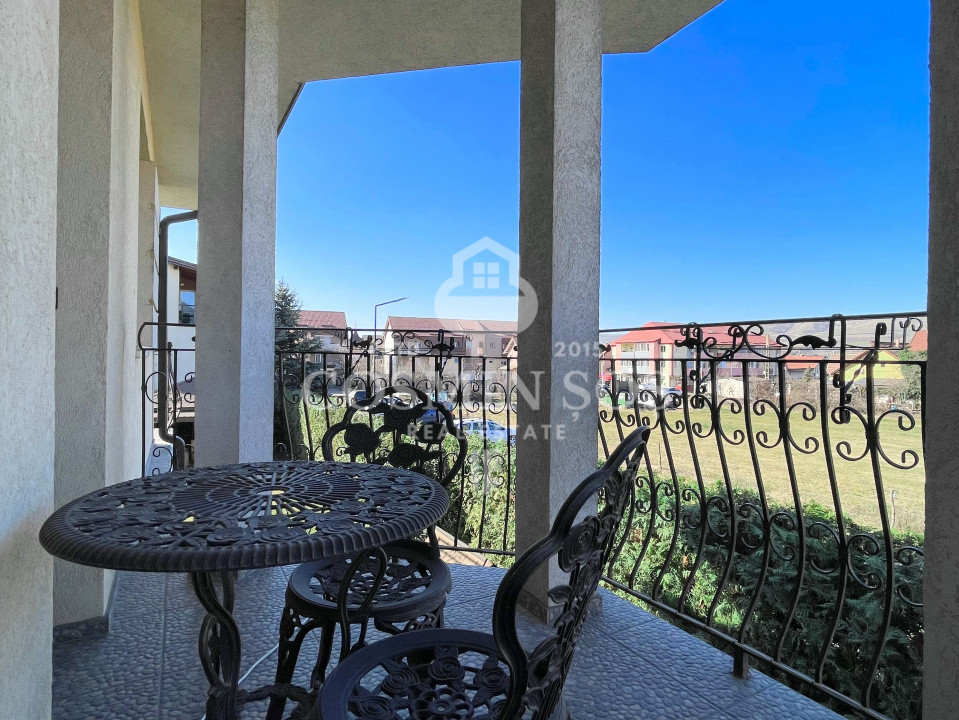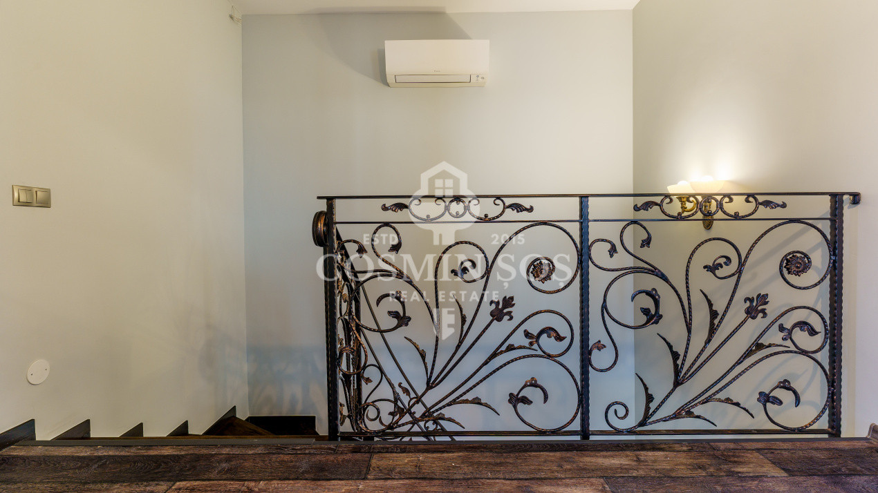 Etaj: hol, trei dormitoare, fiecare cu ieșire pe balcon și priveliște plăcută asupra curții și a spațiilor verzi, o baie generoasă și luminoasă, precum și acces către pod.