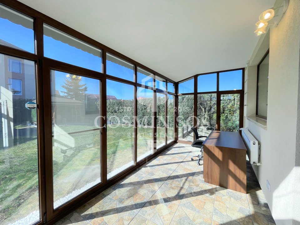 Parter: hol de acces, baie, bucătărie, spălătorie, precum și un living spațios, cu zonă de dining, ideal pentru relaxare și timp petrecut alături de familie. Tot la acest nivel se regăsește terasa închisă, transformată într-un birou luminos și intim, cu acces direct către curtea casei.