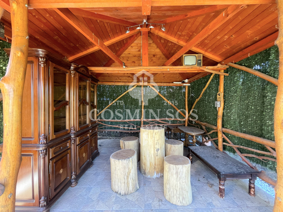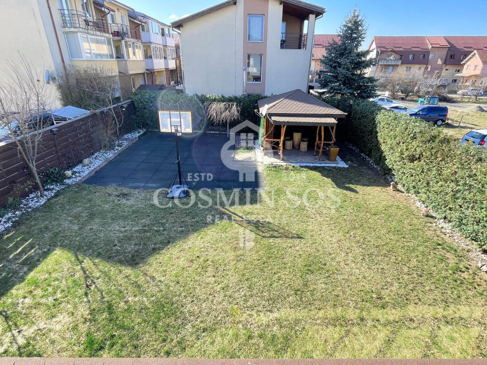 Terenul aferent are o suprafață totală de 499 mp și găzduiește o curte superb amenajată, organizată pe mai multe zone funcționale: spațiu de joacă pentru copii, zonă de relaxare, foișor cu loc de luat masa – perfect pentru picnicuri sau întâlniri în aer liber – toate înconjurate de gard viu din pomi fructiferi și tuia, care oferă un plus de intimitate.