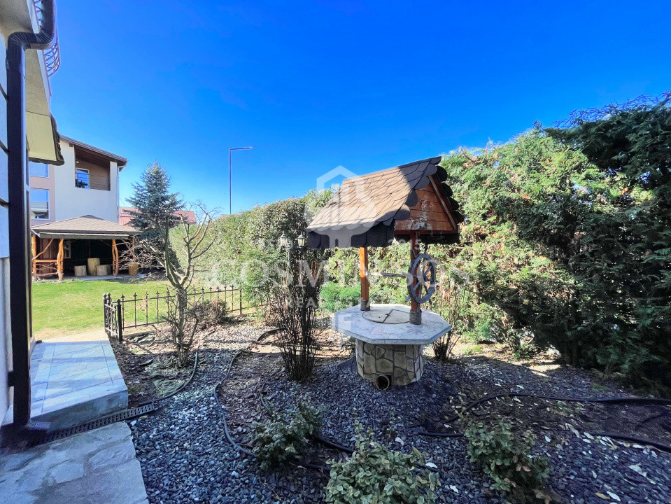 Curtea din fața casei completează armonios proprietatea, fiind amenajată cochet cu vegetație, elemente decorative și o fântână cu un farmec aparte. Zona pavată permite parcarea a două autoturisme și a bicicletelor, accesul realizându-se prin poartă automatizată.